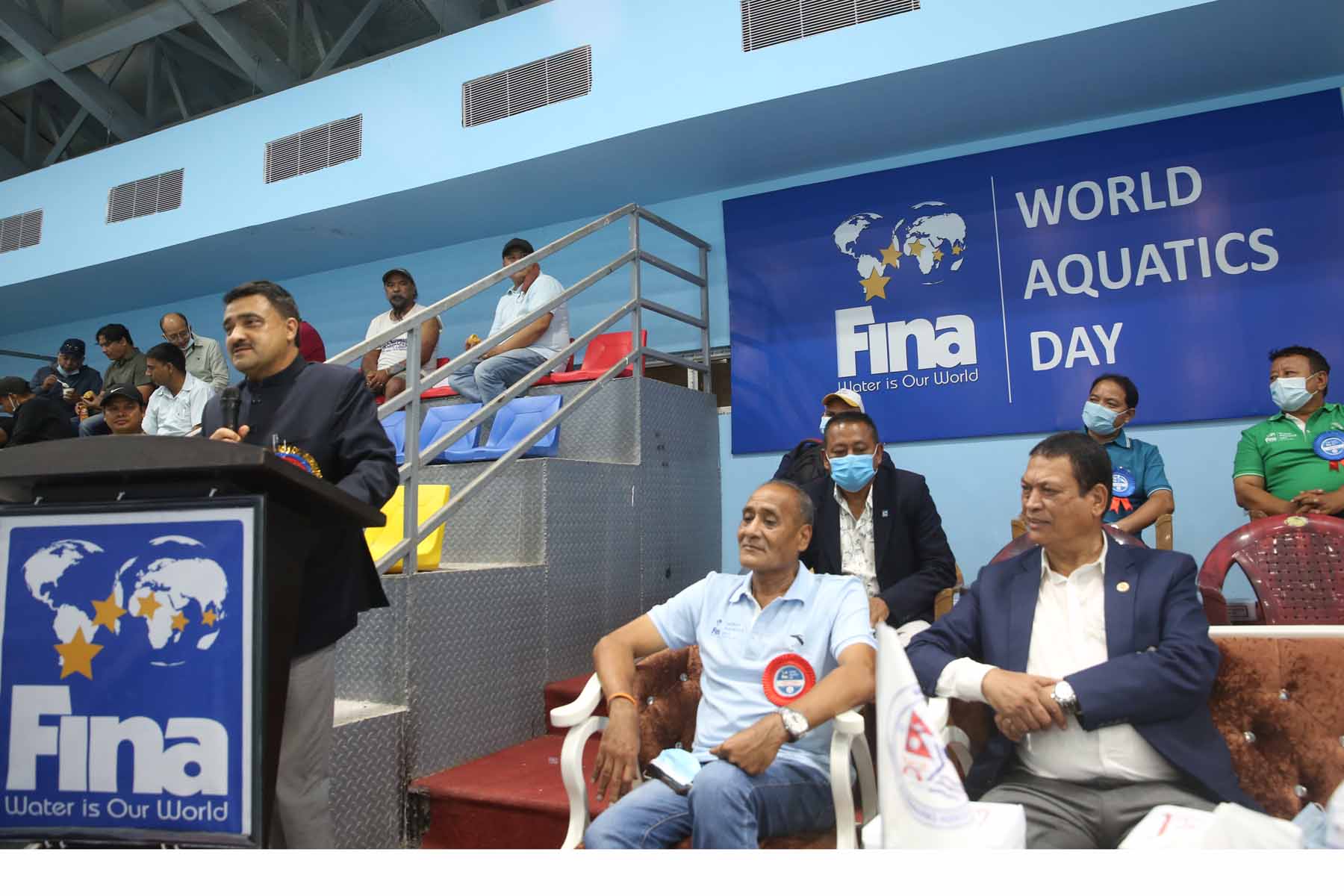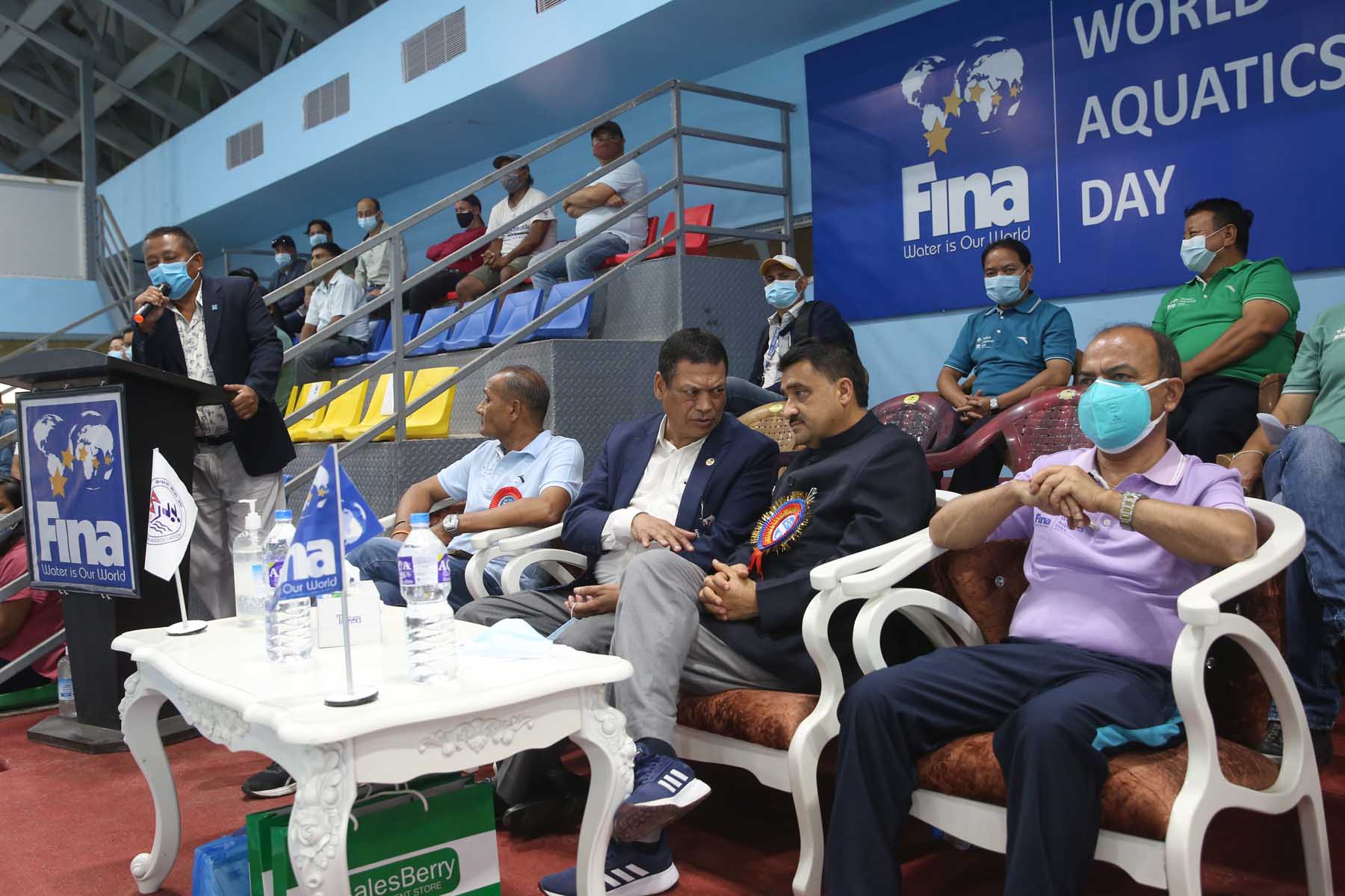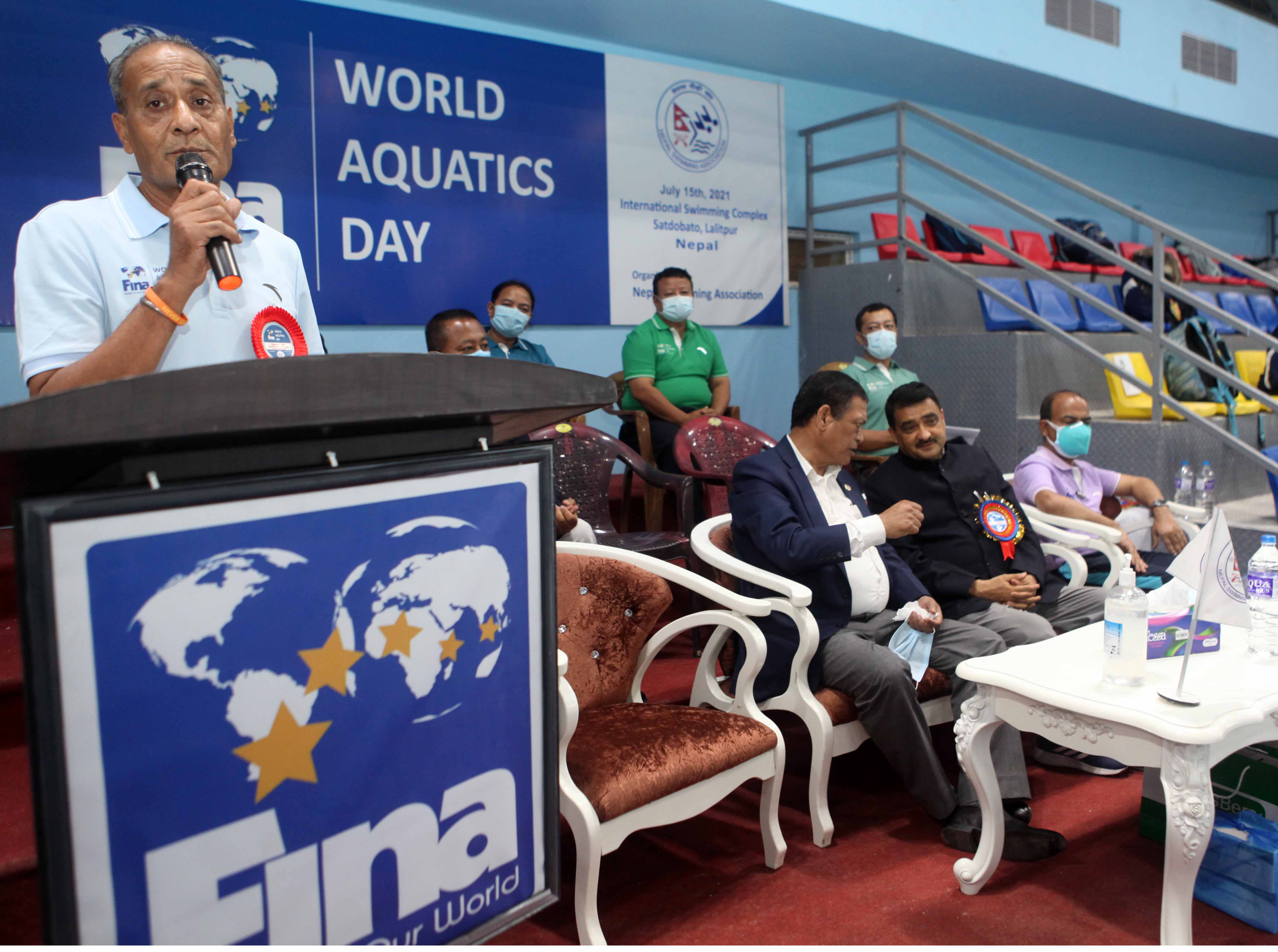 A few snaps captured while delivering oration from the Chief Guest Mr. Ramesh Silwal, Member Secretary of National Sports Council, Special Guests Mr. Nilendra Raj Shrestha, Secretary General of Nepal Olympic Committee, Mr. Ashok Ratna Bajracharya, President of Nepal Swimming Association and Jagat Man Shrestha, Secretary General of Nepal Swimming Association About FINA World Aquatics Day: In January 2016, during the FINA Bureau Meeting held in Budapest, Hungary, a worldwide aquatic day was recognized to celebrate the aquatic sports around the world on a common day. The FINA World Aquatics Day is a day to celebrate and encourage the power of aquatic sports for social wellbeing and development in all corners of the world. It will be celebrated every year during the first weekend of July, before July 19th - the date of the foundation of FINA in London 1908, marking each year the anniversary of FINA.