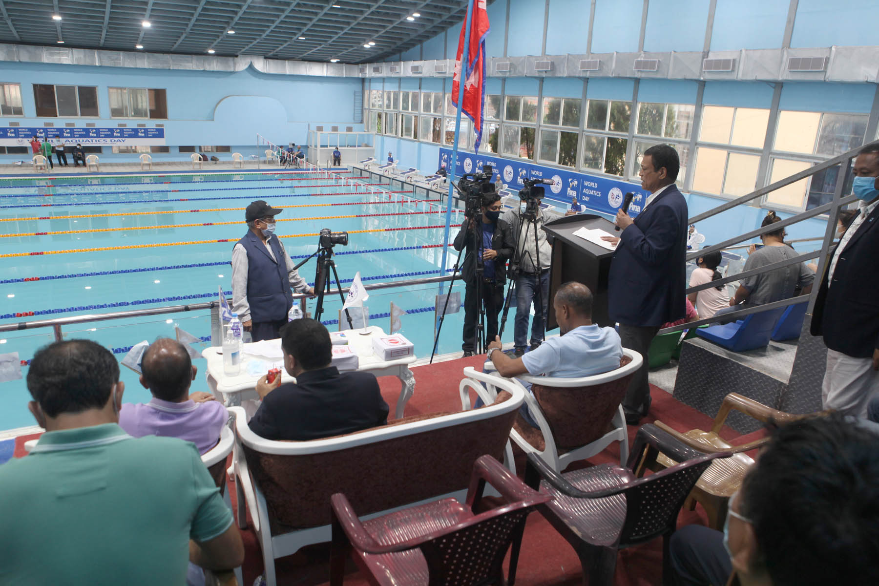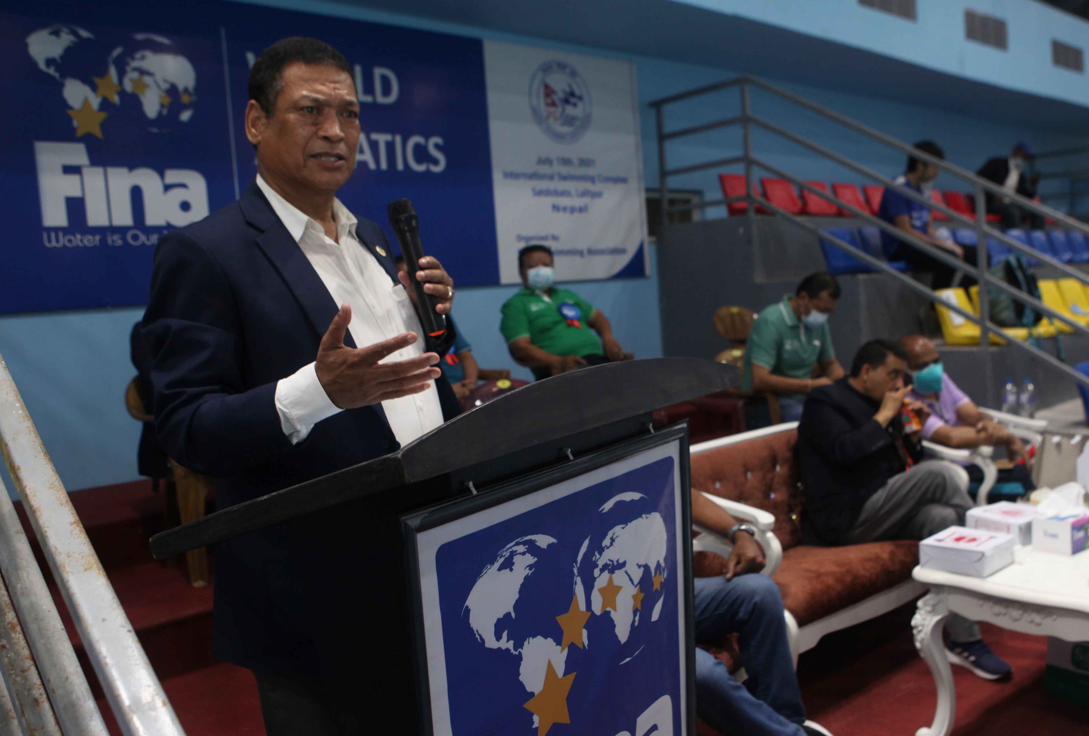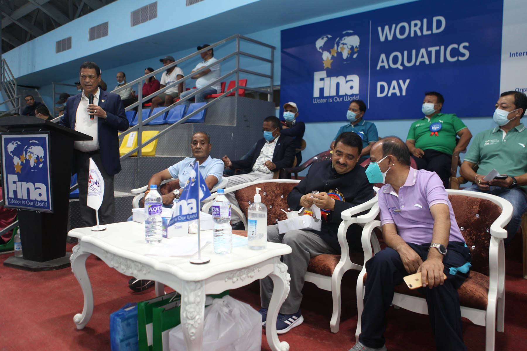 A few snaps captured while delivering oration from the Chief Guest Mr. Ramesh Silwal, Member Secretary of National Sports Council, Special Guests Mr. Nilendra Raj Shrestha, Secretary General of Nepal Olympic Committee, Mr. Ashok Ratna Bajracharya, President of Nepal Swimming Association and Jagat Man Shrestha, Secretary General of Nepal Swimming Association About FINA World Aquatics Day: In January 2016, during the FINA Bureau Meeting held in Budapest, Hungary, a worldwide aquatic day was recognized to celebrate the aquatic sports around the world on a common day. The FINA World Aquatics Day is a day to celebrate and encourage the power of aquatic sports for social wellbeing and development in all corners of the world. It will be celebrated every year during the first weekend of July, before July 19th - the date of the foundation of FINA in London 1908, marking each year the anniversary of FINA.